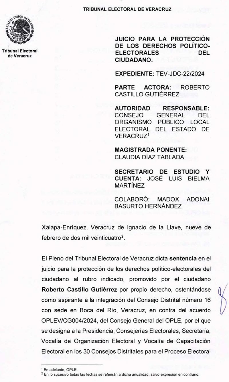 En el expediente TEV-JDC/13-2024 se revoca la designación de las consejeras electorales segunda y tercera, Ana Karen Silva Espejo y Maricela Calderón Díaz del Consejo Distrital 14, en Veracruz 1, Veracruz.