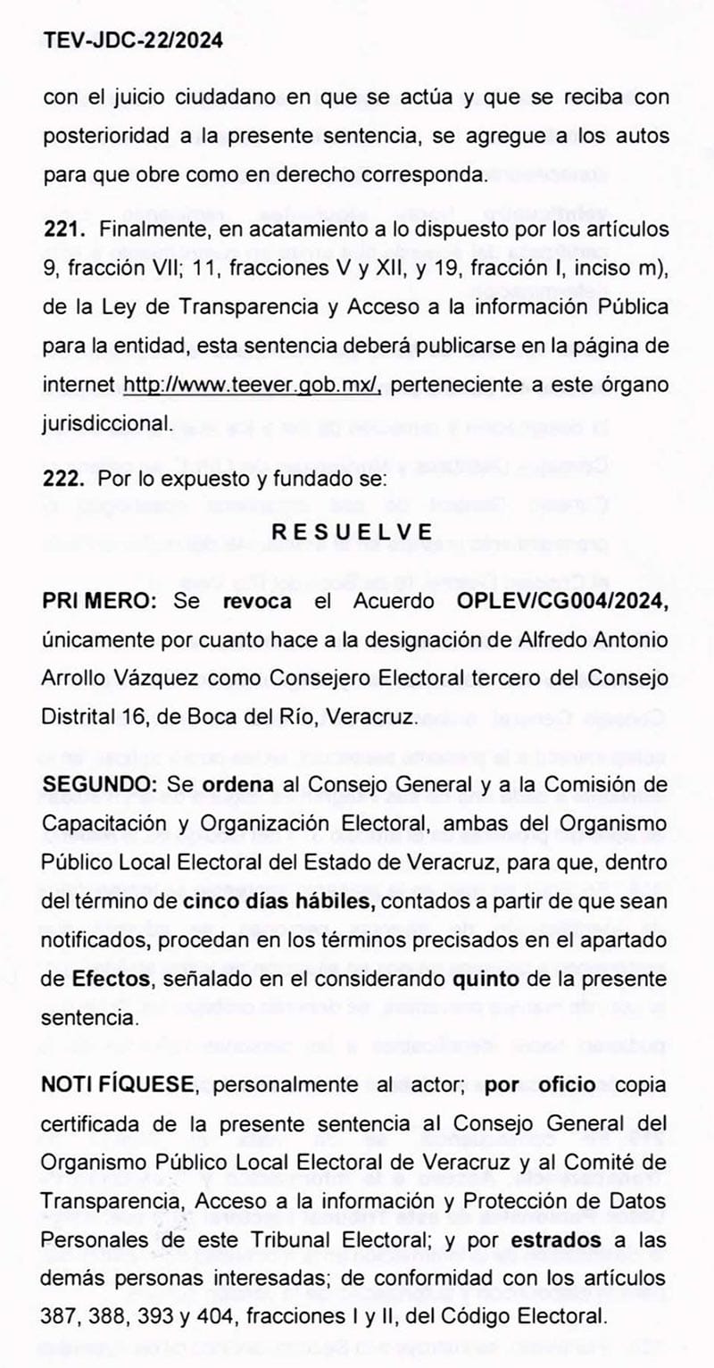 Por último, en el expediente TEV-JDC/19-2024, se revocó el mismo acuerdo, respecto a la designación de igual manera del tercer Consejero Electoral del Consejo Distrital 16 Boca del Río, el C. Alfredo Antonio Arrollo Vázquez.