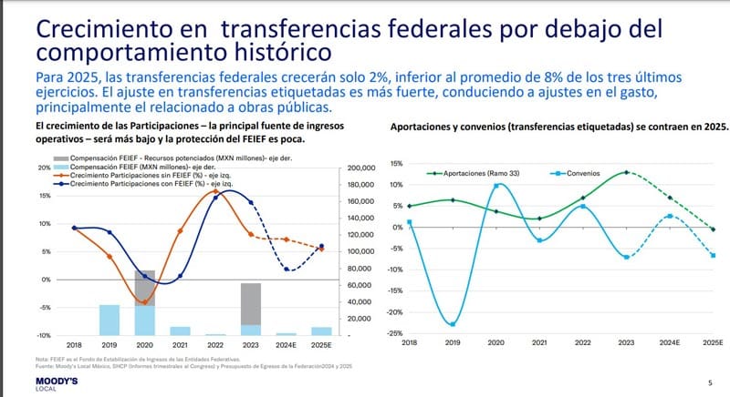 “En 2025, las transferencias federales crecerán a un menor ritmo comparado con los tres últimos años. Aunque las Participaciones crecerán 6 % , las Aportaciones (transferencias etiquetadas) tendrán una contracción de – 0 . 5 % , limitando recursos para cubrir programas de infraestructura y sociales”.