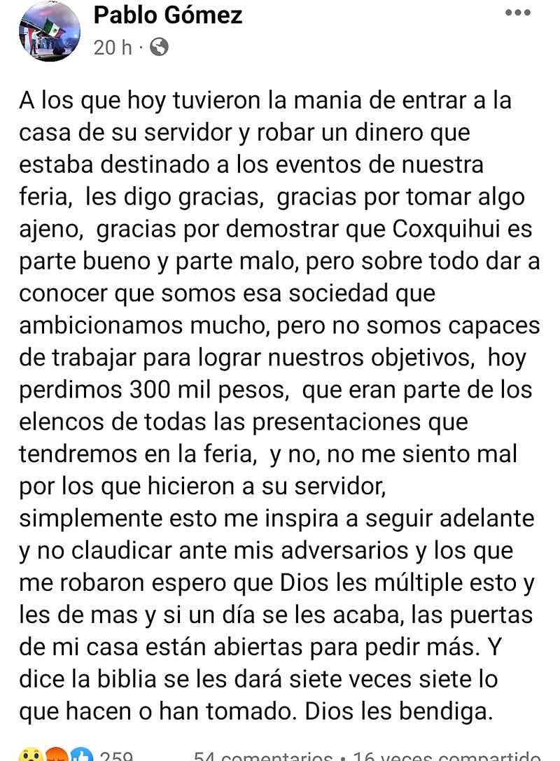 "A los que hoy tuvieron la manía de entrar a la casa de su servidor y robar un dinero que estaba destinado a los eventos de nuestra feria, les digo gracias, gracias por tomar algo ajeno, gracias por demostrar que Coxquihui es parte bueno y parte malo, pero sobre todo dar a conocer que somos esa sociedad que ambicionamos mucho..."