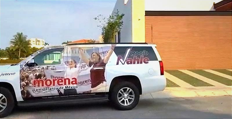 Boca del Río, Ver. Una camioneta de lujo con logotipos de la candidata a la gubernatura de Veracruz, Rocío Nahle García, aparece aparcada en el frente de una residencia del Fraccionamiento El Dorado, en la Riviera Veracruzana, en Boca del Río.