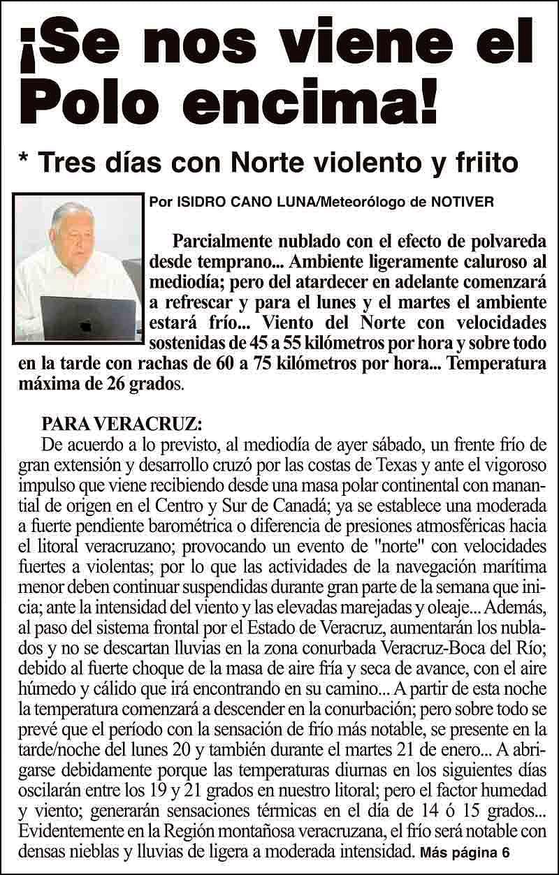 PRIMERA ¡SE NOS VIENE EL POLO ENCIMA! - *TRES DÍAS CON NORTE VIOLENTO Y FRITO 19 enero 2025 Más Noticias ¡YA HAY TERNA! - RAÚL PEIMBERT EN LA LISTA ¡“CEMENTERIO”! - DE ULÚAS ¡INAUGURA PATY OTRA CALLE! ¡NO LE CREYERON! - Y LO BUSCAN NOTI-MEME | - ECOS DEL INFORME! ¡VERÓNICA VA CON NAHLE! - Y AL CONGRESO ¡“FAST TRACK”! - *Mientras el Mariner salía y entraba de Pajaritos en Coatzacoalcos ¡OPERATIVO LUPE-REYES! ¡MANDAN LA BILLETIZA! - *Corea manda 150 mil dólares ¡CRISTINA GANA LA ELECCIÓN!
