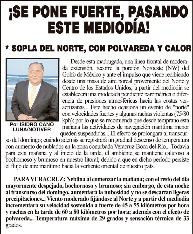 PRIMERA ¡SE PONE FUERTE, PASANDO ESTE MEDIODÍA! - * SOPLA DEL NORTE, CON POLVAREDA Y CALOR 9 marzo 2024 Más Noticias ¡YA HAY TERNA! - RAÚL PEIMBERT EN LA LISTA ¡“CEMENTERIO”! - DE ULÚAS ¡INAUGURA PATY OTRA CALLE! ¡NO LE CREYERON! - Y LO BUSCAN NOTI-MEME | - ECOS DEL INFORME! ¡VERÓNICA VA CON NAHLE! - Y AL CONGRESO ¡“FAST TRACK”! - *Mientras el Mariner salía y entraba de Pajaritos en Coatzacoalcos ¡OPERATIVO LUPE-REYES! ¡MANDAN LA BILLETIZA! - *Corea manda 150 mil dólares ¡CRISTINA GANA LA ELECCIÓN!