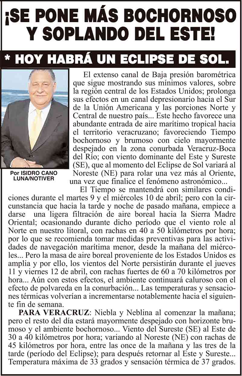 PRIMERA ¡SE PONE MÁS BOCHORNOSO Y SOPLANDO DEL ESTE! - *HOY HABRÁ UN ECLIPSE DE SOL 8 abril 2024 Más Noticias ¡YA HAY TERNA! - RAÚL PEIMBERT EN LA LISTA ¡“CEMENTERIO”! - DE ULÚAS ¡INAUGURA PATY OTRA CALLE! ¡NO LE CREYERON! - Y LO BUSCAN NOTI-MEME | - ECOS DEL INFORME! ¡VERÓNICA VA CON NAHLE! - Y AL CONGRESO ¡“FAST TRACK”! - *Mientras el Mariner salía y entraba de Pajaritos en Coatzacoalcos ¡OPERATIVO LUPE-REYES! ¡MANDAN LA BILLETIZA! - *Corea manda 150 mil dólares ¡CRISTINA GANA LA ELECCIÓN!