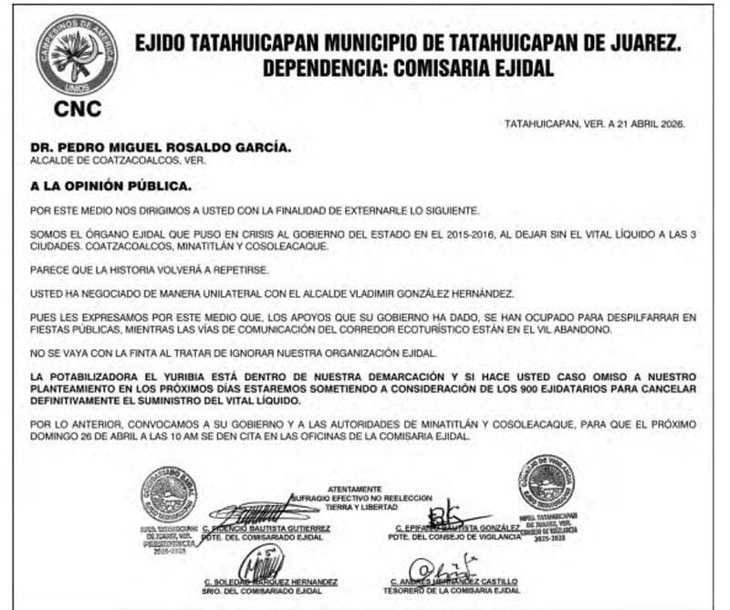 Por medio de dos comunicados emitidos desde el martes 21 de abril, el órgano ejidal se dirigió al alcalde de Coatzacoalcos, Pedro Miguel Rosaldo García para advertir que las ciudades que reciben agua potable de la presa Yuribia podrían volver a quedarse sin el suministro del líquido debido a que “ha negociado de manera unilateral con el alcalde Vladimir González Martínez”.