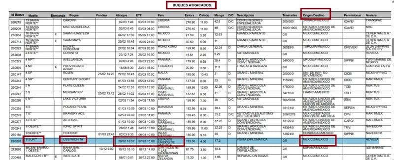 Oficialmente la entrada del buque se informó el pasado día 28 de febrero a las 10:57 de la mañana, país de procedencia Estados Unidos, a pesar de que tuvo contemplada hora de salida el pasado día 2 a las 3 de la tarde, se da a conocer que su destino es México, es decir permanece en aguas nacionales.