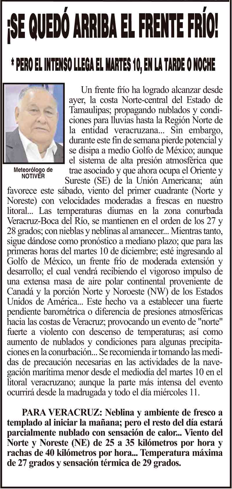 PRIMERA ¡SE QUEDÓ ARRIBA EL FRENTE FRÍO! - *PERO EL INTENSO LLEGA EL MARTES 10, EN LA TARDE O NOCHE 7 diciembre 2024 Más Noticias ¡ASESINAN A EX CANDIDATO A LA ALCALDÍA DE MISANTLA! - *Era del Movimiento Ciudadano ¡HOMENAJE PÓSTUMO AL “PAPO”! ¡SE VA EL FOFO! - DEL PRI LA ENCUESTA | - FELICIDADES! ¡SE DESCARRILA EL TREN! - PA’SUSTO ¡YA NO COBRARÁN PARQUÍMETROS! ¡SE VAN POR LAS NUBES LOS PAVOS! ¡DETECTAR DISFAGIA A TIEMPO PREVIENE LAS COMPLICACIONES DE SALUD: IMSS VERACRUZ NORTE! ¡CUATRO MUNICIPIOS SUBIRÁN EL PREDIAL! - YA SE SUPO ¡CUMBRE DE TRANSPORTE MULTIMODAL!