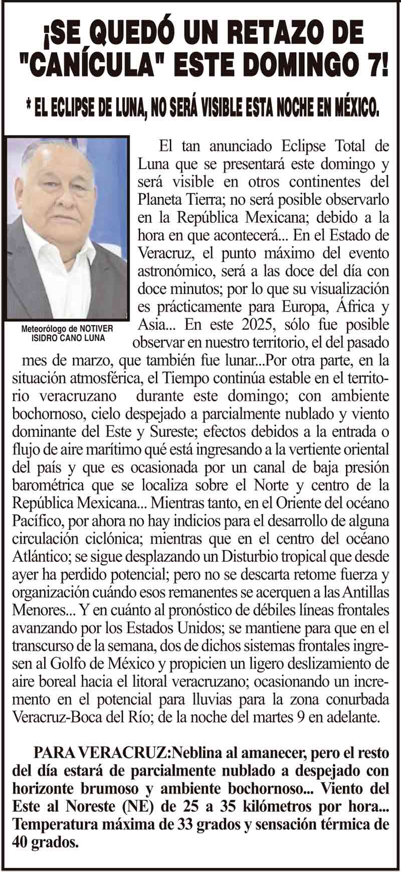 PRIMERA ¡SE QUEDÓ UN RETAZO DE "CANÍCULA" ESTE DOMINGO 7! - *EL ECLIPSE DE LUNA, NO SERÁ VISIBLE ESTA NOCHE EN MÉXICO. 7 septiembre 2025 Más Noticias LA PORTADA - SÁBADO 11 DE ABRIL 2026 ¡PASA EL PLAN B! - TOPE A REGIEDURÍAS ¡VINO TERESO! - EL DE LA CTM ¡PARALIZADOS! - CAOS EN CHICONTEPEC ¡YA HAY CONSEJO DE SALUD MENTAL! ¡VAN CONTRA INVASORES! - DE MANGLARES ¡NO QUIEREN ‘CHOU’! - Y LA REVIENTAN... ¡EJECUTAN A LÍDER DE LA CTM! - EN IXHUATLÁN DEL SURESTE ¡MUERE MARTHA ELSA DURAZZO! - LUTO EN LAS LETRAS ¡BUSCAN EVITAR FRAUDES EN LA COMPRA DE COCHES!