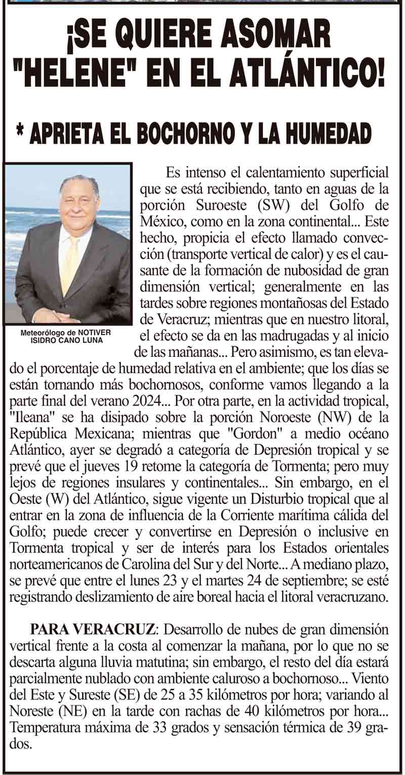 PRIMERA ¡SE QUIERE ASOMAR "HELENE" EN EL ATLÁNTICO! - *APRIETA EL BOCHORNO Y LA HUMEDAD 16 septiembre 2024 Más Noticias ¡‘CAZAN’ AL SERVAL DE LA RIVIERA! ¡QUE LO PROTEJAN! - *PAN pide medidas para alcalde de Banderilla ¡SE CAEN LAS REMESAS! - PURAS PÉRDIDAS ¡EMERGENCIA EN PEMEX! - SE PRENDE DUCTO EN PAJARITOS ¡MULTARÁN A CONSTRUCTORAS! - TENÍA QUE SER ¡SOLUCIONAN PROBLEMÁTICA VECINAL! - *Con visitas sorpresas dice Maryjose LOS CARTONES ¡APOYARÁN CON TODO A VALERIA! ¡DENUNCIA INTENTO DE ‘LEVANTÓN’ EN ESTACIONAMIENTO DE BOCA DEL RÍO! LA ENCUESTA | - SUBIERON!