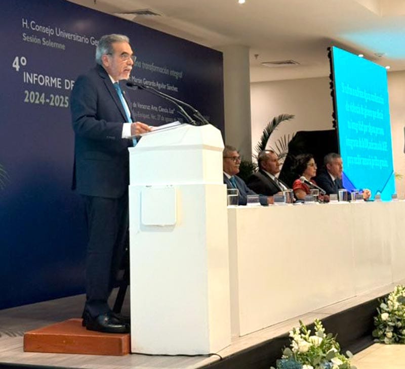 Entre los logros, dijo que en este periodo se edificaron 77 aulas, 52 cubículos, 2 salas de juicios orales, 6 comedores universitarios y un teatro universitario.