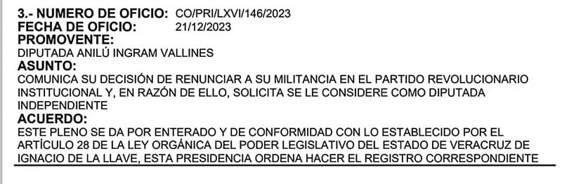 El oficio número CO/PRI/LXVI/146/2023 informó que “comunica su decisión de renunciar a su militancia en el Partido Revolucionario Institucional y, en razón de ello, solicita se le considere como diputada independiente. Este pleno se da por enterado y de conformidad con lo establecido por el artículo 28 de la ley orgánica del poder legislativo del estado de Veracruz de Ignacio de la llave, esta presidencia ordena hacer el registro correspondiente”.