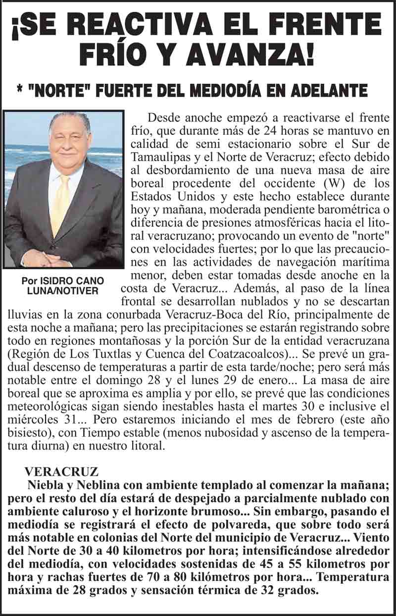 PRIMERA ¡SE REACTIVA EL FRENTE FRÍO Y AVANZA! * "NORTE" FUERTE DEL MEDIODÍA EN ADELANTE 27 enero 2024 Más Noticias ¡SE ESTÁ FORMANDO UN INTENSO "NORTE" PARA EL LUNES 8! - *UN FIN DE SEMANA CON CALOR, BRUMA Y DEL ESTE ¡YA HAY TERNA! - RAÚL PEIMBERT EN LA LISTA ¡“CEMENTERIO”! - DE ULÚAS ¡INAUGURA PATY OTRA CALLE! ¡NO LE CREYERON! - Y LO BUSCAN NOTI-MEME | - ECOS DEL INFORME! ¡VERÓNICA VA CON NAHLE! - Y AL CONGRESO ¡“FAST TRACK”! - *Mientras el Mariner salía y entraba de Pajaritos en Coatzacoalcos ¡OPERATIVO LUPE-REYES! ¡MANDAN LA BILLETIZA! - *Corea manda 150 mil dólares