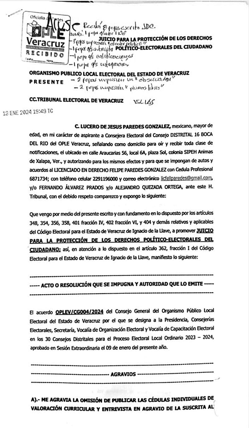 De igual manera argumentan que existió favoritismo hacia algunos partidos políticos al momento de la designación, como el caso de la C. Mirna Cruz Lara, quien fue seleccionada para ser Consejera Electoral en el Consejo Distrital 15 de Boca del Río y es hermana del C. Fernando Cruz Lara, delegado de MORENA y operador político de Sergio Rodríguez Cortés, titular de la PMA.