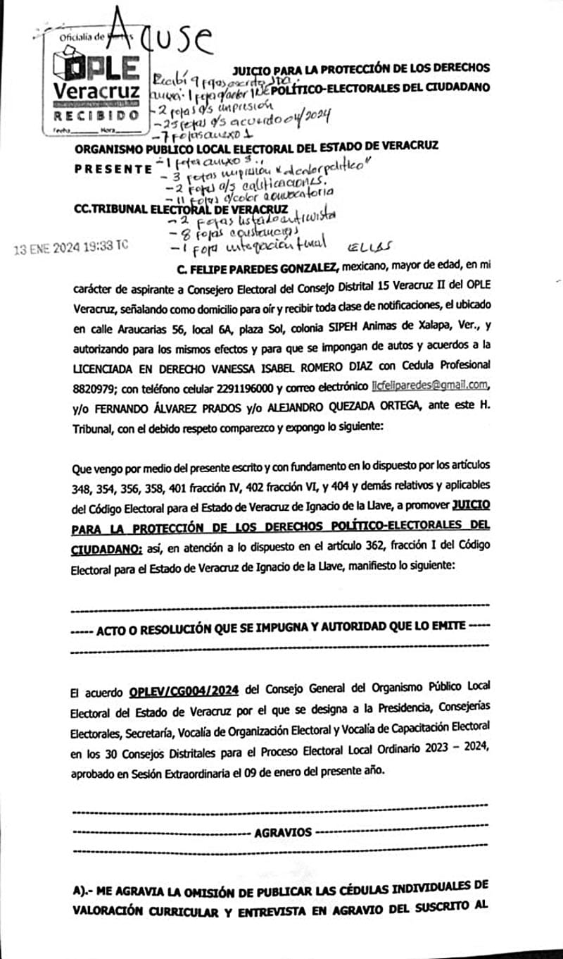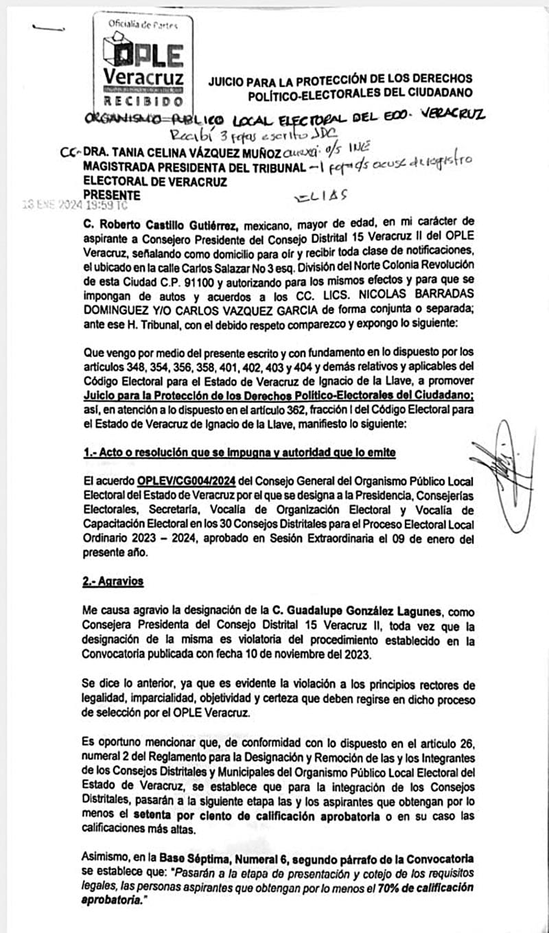 "... CC-DRA. TANIA CELINA VÁZQUEZ MUÑOZ, MAGISTRADA PRESIDENTA DEL TRIBUNAL... C. Roberto Castillo Gutiérrez, mexicano, mayor de edad, en mi carácter de aspirante a Consejero Presidente del Consejo Distrital 15 Veracruz II del OPLE Veracruz, con el debido respeto comparezco y expongo lo siguiente: