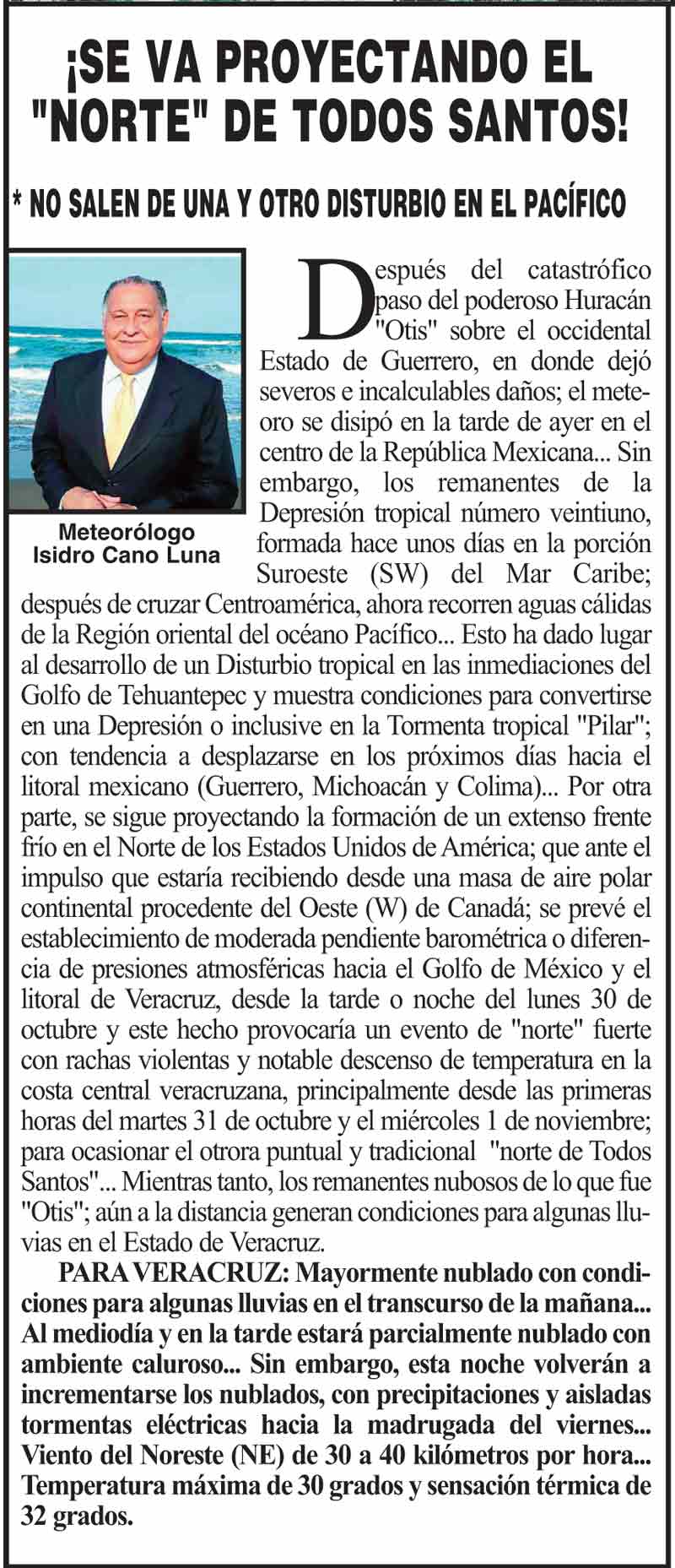 PRIMERA ¡SE VA PROYECTANDO EL "NORTE" DE TODOS SANTOS! * NO SALEN DE UNA Y OTRO DISTURBIO EN EL PACÍFICO 26 octubre 2023 Más Noticias ¡LA DEFIENDE ESTEBAN! - *Condena las criticas del papá de Cui ¡14 AÑOS SIN REGINA! - *Y no hay justicia ¡MUERE LUIS MUSLERA! - “EL CROMO” LOS CARTONES ¡RESCATAN 101 HUEVOS DE TORTUGA LORA! ¡AUMENTAN FUGAS DE GAS! - *Cuatro a 5 servicios diarios, por la ola de calor ¡Y LO TUNDEN! - A ATANASIO ¡BERTHA PIDE LICENCIA! ¡NAHLE REVIRA! - *“Yo ando trabajando”, dice tras polémica por críticas de Atanasio ¡NO LE GUSTÓ A ROSA! - *No abonan a la unidad y solo benefician a quienes buscan la división