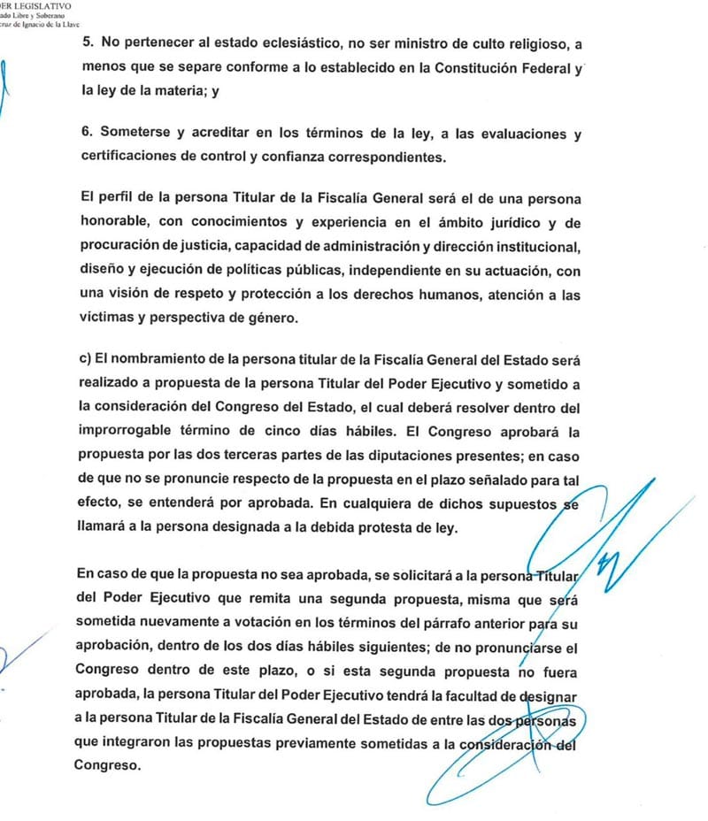 Para ocupar el cargo, el perfil debe ser honorable, con experiencia en el ámbito jurídico y de procuración de justicia, capacidad administrativa, independencia y visión de respeto a derechos humanos y perspectiva de género.