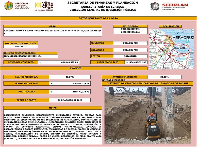 Boca del Río, Ver. La Secretaría de Finanzas y Planeación (SEFIPLAN), del estado de Veracruz, gastó casi mil millones de pesos en las primeras etapas de reconstrucción del estadio Luis ‘Pirata’ de la Fuente que todavía no concluyen como lo indican las especificaciones contractuales que datan del 2023.