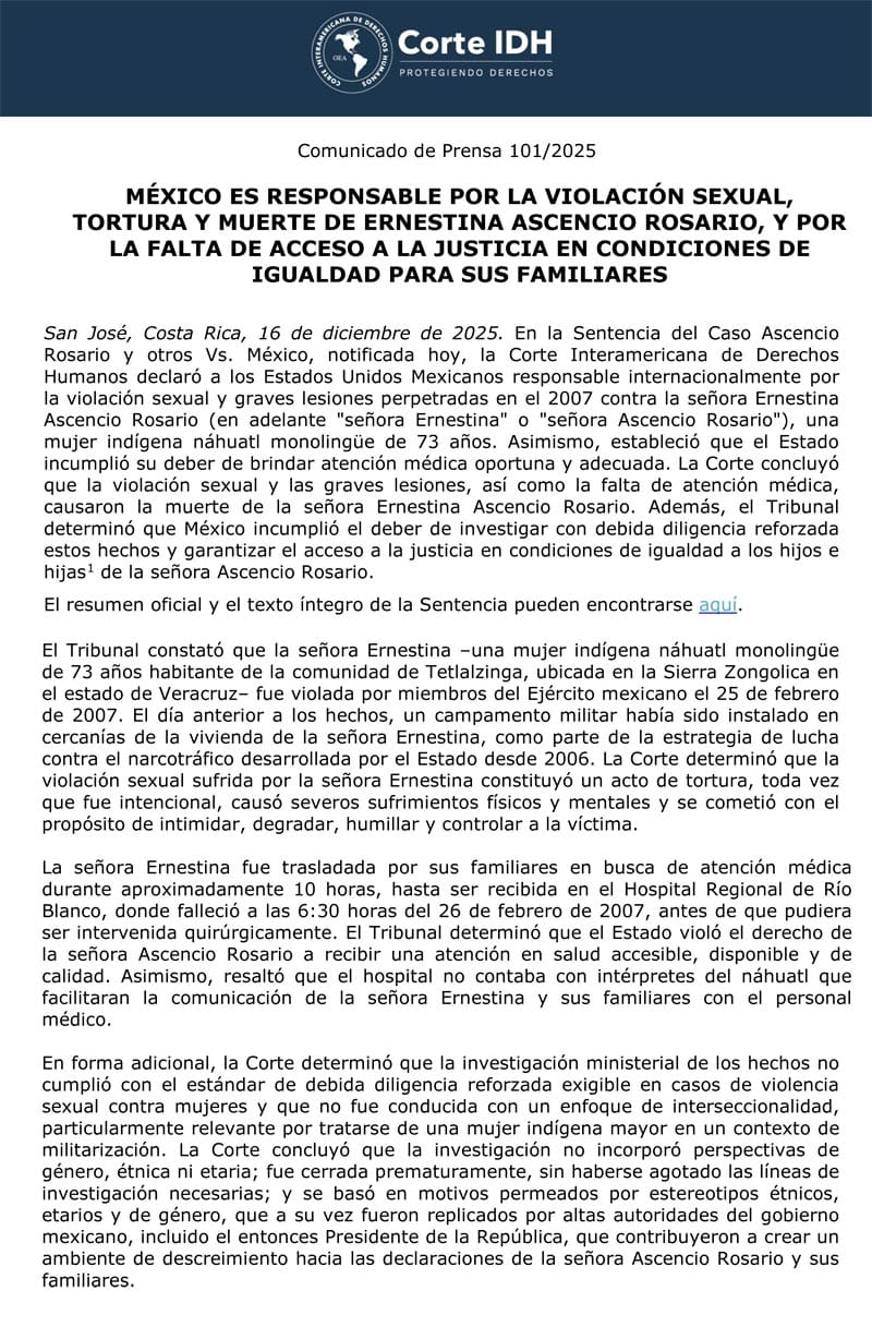 En una sentencia histórica que pone fin a 18 años de impunidad y versiones oficiales distorsionadas, la Corte Interamericana de Derechos Humanos (Corte IDH) declaró al Estado mexicano responsable por la violación sexual, tortura y muerte de la señora Ernestina Ascencio Rosario, una mujer indígena náhuatl de 73 años, habitante de la Sierra de Zongolica.