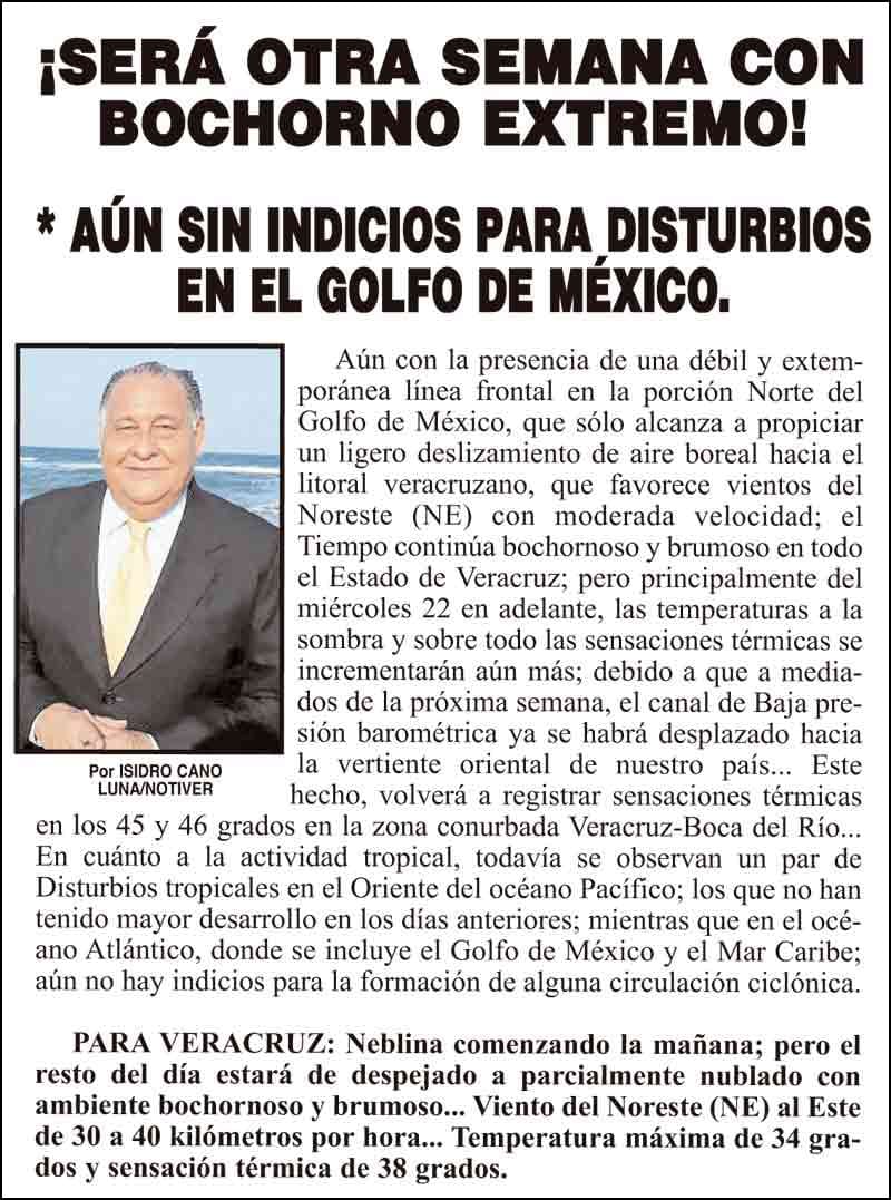 PRIMERA ¡SERÁ OTRA SEMANA CON BOCHORNO EXTREMO! - * AÚN SIN INDICIOS PARA DISTURBIOS EN EL GOLFO DE MÉXICO. 19 mayo 2024 Más Noticias ¡YA HAY TERNA! - RAÚL PEIMBERT EN LA LISTA ¡“CEMENTERIO”! - DE ULÚAS ¡INAUGURA PATY OTRA CALLE! ¡NO LE CREYERON! - Y LO BUSCAN NOTI-MEME | - ECOS DEL INFORME! ¡VERÓNICA VA CON NAHLE! - Y AL CONGRESO ¡“FAST TRACK”! - *Mientras el Mariner salía y entraba de Pajaritos en Coatzacoalcos ¡OPERATIVO LUPE-REYES! ¡MANDAN LA BILLETIZA! - *Corea manda 150 mil dólares ¡CRISTINA GANA LA ELECCIÓN!