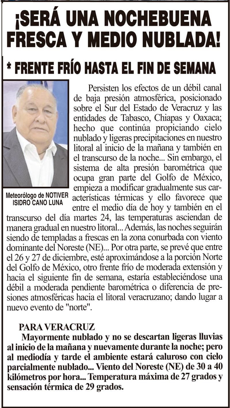 PRIMERA ¡SERÁ UNA NOCHEBUENA FRESCA Y MEDIO NUBLADA! - *FRENTE FRÍO HASTA EL FIN DE SEMANA 23 diciembre 2024 Más Noticias LA PORTADA - VIERNES 5 DE DICIEMBRE 2025 ¡HOY SOPLA FRESCO Y DE FRENTE! - *PERO EL LUNES 8, ESTARÁ FUERTE Y CON LLUVIAS. LA ENCUESTA | - ME ESTÁS OYENDO INÚTIL?... ¡CON BAILONGOS QUIEREN AYUDAR A LOS DAMNIFICADOS DEL NORTE! - *El mismo Alor, toca los timbales ¡YA SE LA APROBARON! - REFORMA PARA LA FISCALÍA ESTATAL NOTI-MEME | - ASÍ ESTUVO EL INFORME... ¡MÁS DE 9 MIL MILLONES! - *Eso costaría cancelar en Veracruz al Grupo MAS ¡LE DAN LUZ VERDE! - DESDE GUATEMALA ¡EL CUARTO! ¡Y COM-PA-RE-CIÓ! - ÁNDALE...