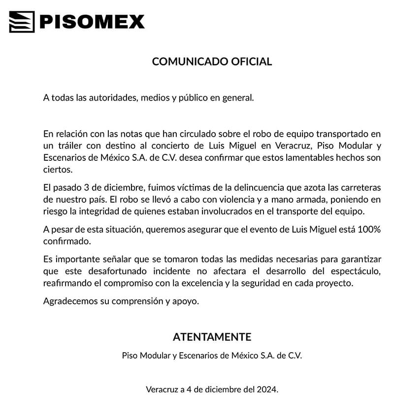 Por su parte la empresa Pisomex también emitió un comunicado oficial, "Piso modular escenarios de México desea confirmar que estos lamentables hechos son ciertos, el pasado 3 de diciembre fuimos víctima de la delincuencia que azota las carreteras de nuestro país, el robo se llevó a cabo con violencia y a mano armada poniendo en riesgo la integridad de quienes estaban involucrados en el transporte del equipo".