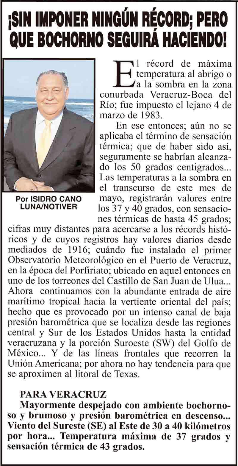 PRIMERA ¡SIN IMPONER NINGÚN RÉCORD; PERO QUE BOCHORNO SEGUIRÁ HACIENDO! - *TEMPERATURA MÁXIMA DE 37 GRADOS Y SENSACIÓN TÉRMICA DE 43 GRADOS. 5 mayo 2024 Más Noticias ¡YA HAY TERNA! - RAÚL PEIMBERT EN LA LISTA ¡“CEMENTERIO”! - DE ULÚAS ¡INAUGURA PATY OTRA CALLE! ¡NO LE CREYERON! - Y LO BUSCAN NOTI-MEME | - ECOS DEL INFORME! ¡VERÓNICA VA CON NAHLE! - Y AL CONGRESO ¡“FAST TRACK”! - *Mientras el Mariner salía y entraba de Pajaritos en Coatzacoalcos ¡OPERATIVO LUPE-REYES! ¡MANDAN LA BILLETIZA! - *Corea manda 150 mil dólares ¡CRISTINA GANA LA ELECCIÓN!