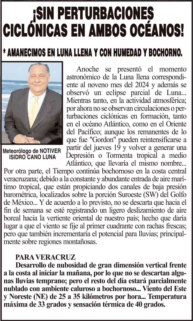 PRIMERA ¡SIN PERTURBACIONES CICLÓNICAS EN AMBOS OCÉANOS! - *AMANECIMOS EN LUNA LLENA Y CON HUMEDAD Y BOCHORNO. 18 septiembre 2024 Más Noticias ¡YA HAY TERNA! - RAÚL PEIMBERT EN LA LISTA ¡“CEMENTERIO”! - DE ULÚAS ¡INAUGURA PATY OTRA CALLE! ¡NO LE CREYERON! - Y LO BUSCAN NOTI-MEME | - ECOS DEL INFORME! ¡VERÓNICA VA CON NAHLE! - Y AL CONGRESO ¡“FAST TRACK”! - *Mientras el Mariner salía y entraba de Pajaritos en Coatzacoalcos ¡OPERATIVO LUPE-REYES! ¡MANDAN LA BILLETIZA! - *Corea manda 150 mil dólares ¡CRISTINA GANA LA ELECCIÓN!