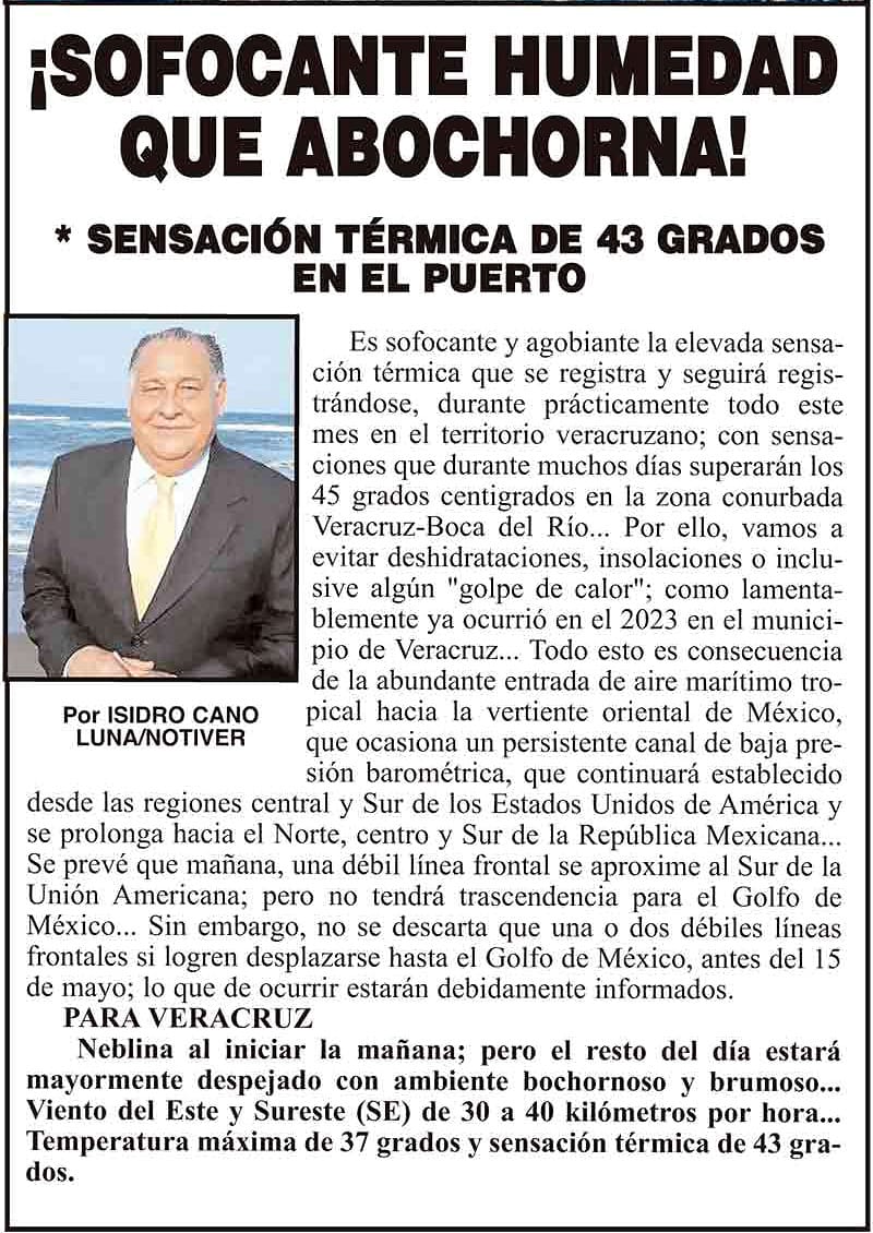 PRIMERA ¡SOFOCANTE HUMEDAD QUE ABOCHORNA! - * SENSACIÓN TÉRMICA DE 43 GRADOS EN EL PUERTO ☀️ 2 mayo 2024 Más Noticias ¡YA HAY TERNA! - RAÚL PEIMBERT EN LA LISTA ¡“CEMENTERIO”! - DE ULÚAS ¡INAUGURA PATY OTRA CALLE! ¡NO LE CREYERON! - Y LO BUSCAN NOTI-MEME | - ECOS DEL INFORME! ¡VERÓNICA VA CON NAHLE! - Y AL CONGRESO ¡“FAST TRACK”! - *Mientras el Mariner salía y entraba de Pajaritos en Coatzacoalcos ¡OPERATIVO LUPE-REYES! ¡MANDAN LA BILLETIZA! - *Corea manda 150 mil dólares ¡CRISTINA GANA LA ELECCIÓN!