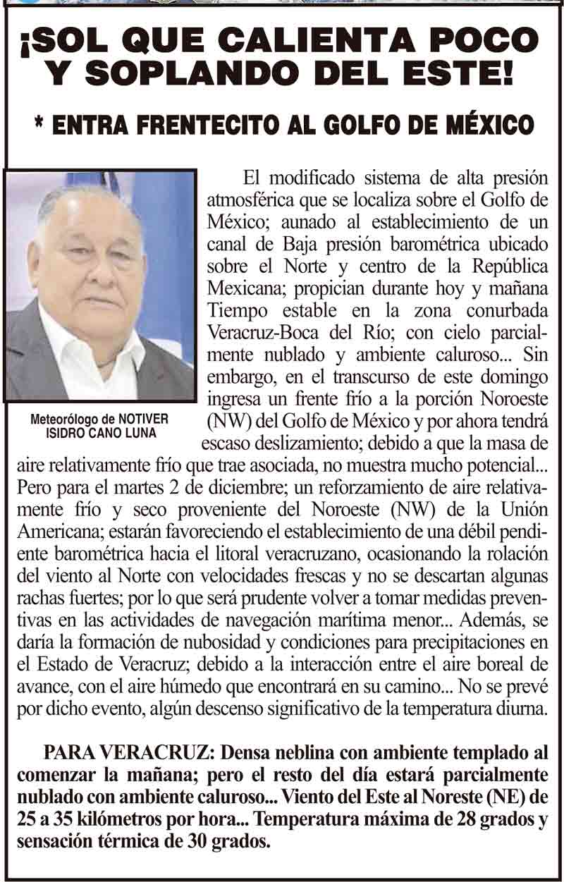 PRIMERA ¡SOL QUE CALIENTA POCO Y SOPLANDO DEL ESTE! - *ENTRA FRENTECITO AL GOLFO DE MÉXICO 30 noviembre 2025 Más Noticias LA ENCUESTA | - ME ESTÁS OYENDO INÚTIL?... ¡CON BAILONGOS QUIEREN AYUDAR A LOS DAMNIFICADOS DEL NORTE! - *El mismo Alor, toca los timbales ¡YA SE LA APROBARON! - REFORMA PARA LA FISCALÍA ESTATAL NOTI-MEME | - ASÍ ESTUVO EL INFORME... ¡MÁS DE 9 MIL MILLONES! - *Eso costaría cancelar en Veracruz al Grupo MAS ¡LE DAN LUZ VERDE! - DESDE GUATEMALA ¡EL CUARTO! ¡Y COM-PA-RE-CIÓ! - ÁNDALE... ¡NO SE VA LISBETH AURELIA! - *Descarta ir a la Fiscalía y que seguirá como magistrada ¡CREAN EL SÚPER MAÍZ!