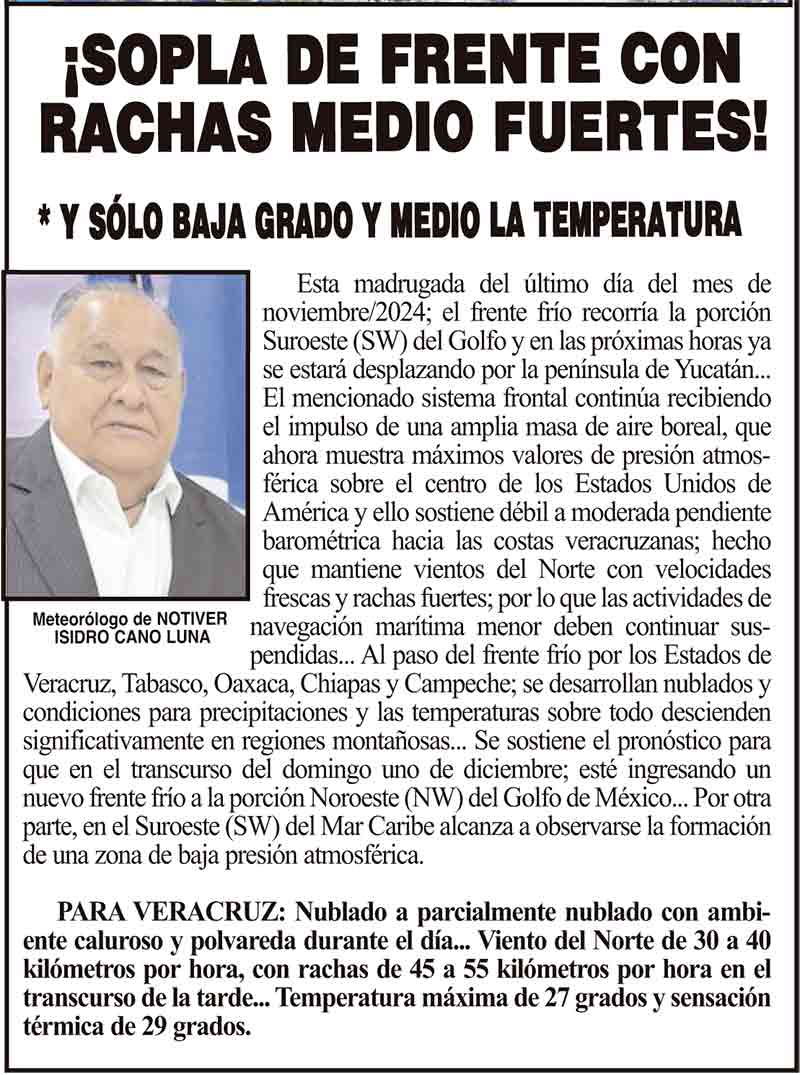 PRIMERA ¡SOPLA DE FRENTE CON RACHAS MEDIO FUERTES! - *Y SÓLO BAJA GRADO Y MEDIO LA TEMPERATURA 30 noviembre 2024 Más Noticias ¡LLEGAN CHINOS A VER EL TRANVÍA! ¡PRIMER LUGAR EN HOMICIDIOS DOLOSOS! - TENIA QUE SER ¡MARYJOSE TENDRÁ SU HOSPITAL! ¡LOS DEJARON SOLOS! - A FAMILIARES DE LA DOCTORA ASESINADA ¡SE LO MOCHAN A EX ALCALDE! - DE COATZA ¡RECONOCEN A CONCHITA DÍAZ CHÁZARO! - *Es la Cronista de la Ciudad NOTI-MEME | - QUÉ LIBRO VAS A REGALAR! ¡SIGUE LA RACHA! ¡CONSTERNACIÓN! - *Muere el profesor Roque Velázquez Rivera LOS CARTONES