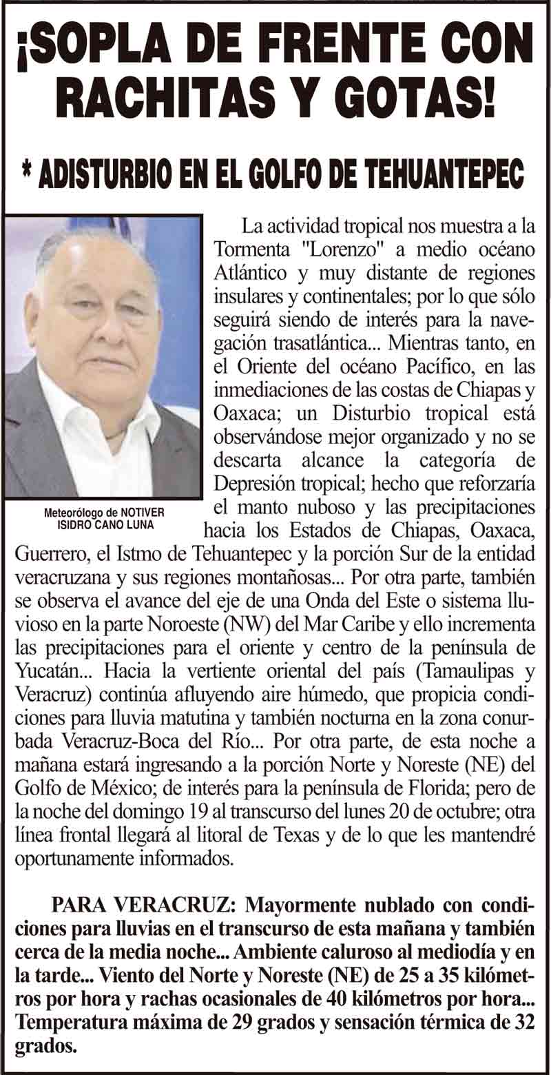 PRIMERA ¡SOPLA DE FRENTE CON RACHITAS Y GOTAS! - *ADISTURBIO EN EL GOLFO DE TEHUANTEPEC 15 octubre 2025 Más Noticias LA PORTADA - SÁBADO 25 DE ABRIL 2026 ¡LOS DEJARON SOLOS! - MORENA VUELVE A REVENTAR SESIÓN ¡VIENEN DESDE COLOMBIA A LA NAVAL! LOS CARTONES ¡NI MEDICAMENTOS NI UNIFORMES! - *En hospital de Boca del Río ¡SE TRAEN CUMBRE AUTOMOTRIZ! ¡REBAMBARAMBA! - MANIOBRISTAS VS. MANIOBRISTAS ¡LO HOMOLOGAN! - *El feminicidio en Veracruz ¡MEGA-CABALGATA! ¡JUSTICIA PARA BERTHA! - MARCHAS POR LA DOCTORA