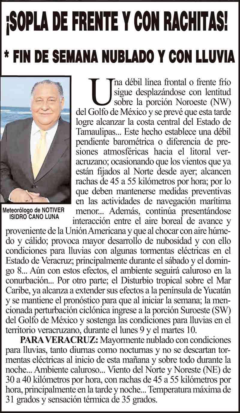 PRIMERA ¡SOPLA DE FRENTE Y CON RACHITAS! - *FIN DE SEMANA NUBLADO Y CON LLUVIA 6 septiembre 2024 Más Noticias ¡CHAPOPOTE EN LA PLAYA CARRIZAL! - Y RECOGEN CASI UNA TONELADA ASEGURAN 16 MOTOS EN OPERATIVO ANTIRODADAS... ¡OPERATIVO DE LA FGR! - CONTRA MAQUINITAS ¡HAY 51 CASOS! - DE SARAMPIÓN ¡INFIERNO EN LA CARRETERA! - ARDE DOBLE REMOLQUE DE COMBUSTIBLE ¡MÁS DE 24 MIL BOQUEÑOS TIENEN UNA DISCAPACIDAD! ¡NO QUIEREN EL FRACKING! - AY NANITAS ¡OTRA TORTUGA MUERTA! ¡REAPARECE “PATOCHIS ”! - AGÁRRENSE... ¡LOS RESCATAN! - LA SEMAR