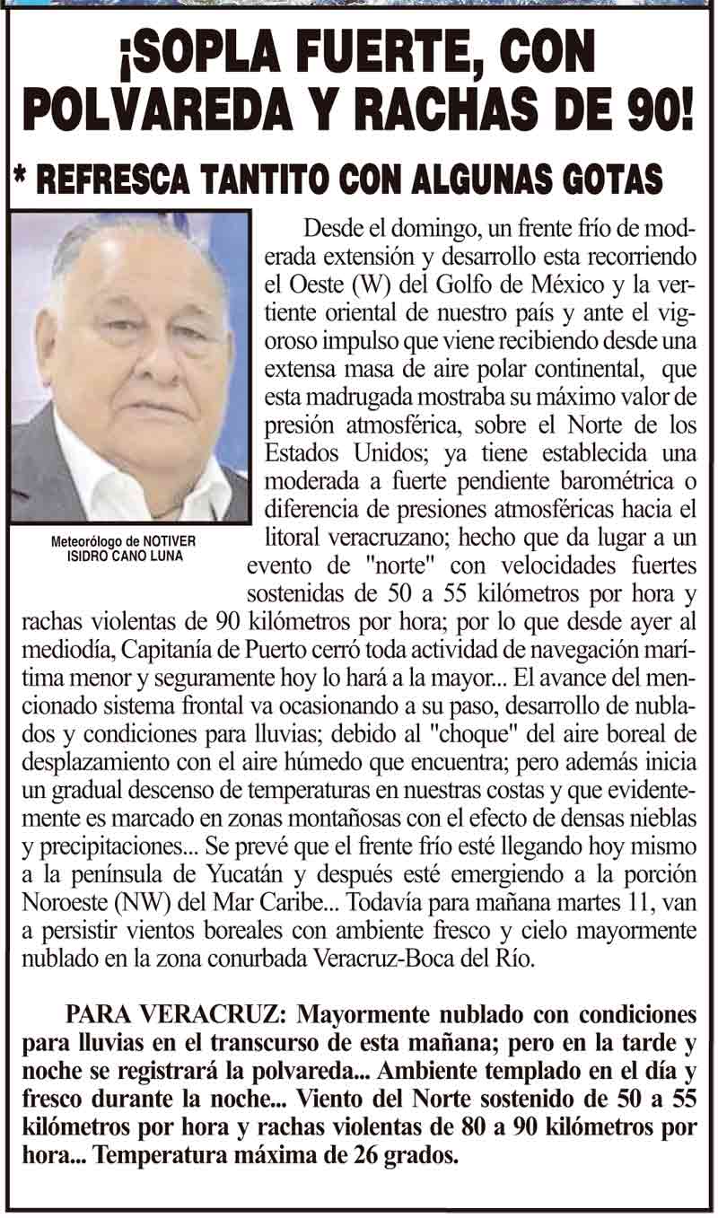 PRIMERA ¡SOPLA FUERTE, CON POLVAREDA Y RACHAS DE 90! - *REFRESCA TANTITO CON ALGUNAS GOTAS 10 noviembre 2025 Más Noticias LA ENCUESTA | - ME ESTÁS OYENDO INÚTIL?... ¡CON BAILONGOS QUIEREN AYUDAR A LOS DAMNIFICADOS DEL NORTE! - *El mismo Alor, toca los timbales ¡YA SE LA APROBARON! - REFORMA PARA LA FISCALÍA ESTATAL NOTI-MEME | - ASÍ ESTUVO EL INFORME... ¡MÁS DE 9 MIL MILLONES! - *Eso costaría cancelar en Veracruz al Grupo MAS ¡LE DAN LUZ VERDE! - DESDE GUATEMALA ¡EL CUARTO! ¡Y COM-PA-RE-CIÓ! - ÁNDALE... ¡NO SE VA LISBETH AURELIA! - *Descarta ir a la Fiscalía y que seguirá como magistrada ¡CREAN EL SÚPER MAÍZ!