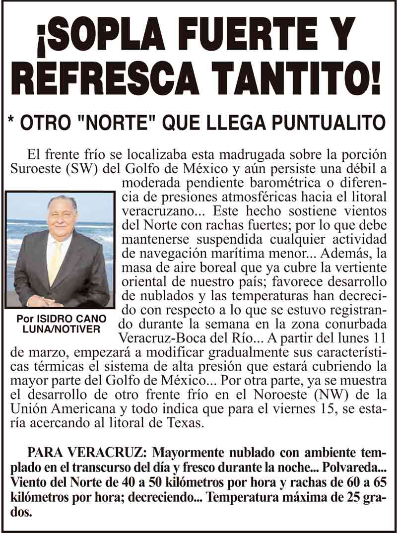 PRIMERA ¡SOPLA FUERTE Y REFRESCA TANTITO! - * OTRO "NORTE" QUE LLEGA PUNTUALITO 10 marzo 2024 Más Noticias ¡YA HAY TERNA! - RAÚL PEIMBERT EN LA LISTA ¡“CEMENTERIO”! - DE ULÚAS ¡INAUGURA PATY OTRA CALLE! ¡NO LE CREYERON! - Y LO BUSCAN NOTI-MEME | - ECOS DEL INFORME! ¡VERÓNICA VA CON NAHLE! - Y AL CONGRESO ¡“FAST TRACK”! - *Mientras el Mariner salía y entraba de Pajaritos en Coatzacoalcos ¡OPERATIVO LUPE-REYES! ¡MANDAN LA BILLETIZA! - *Corea manda 150 mil dólares ¡CRISTINA GANA LA ELECCIÓN!