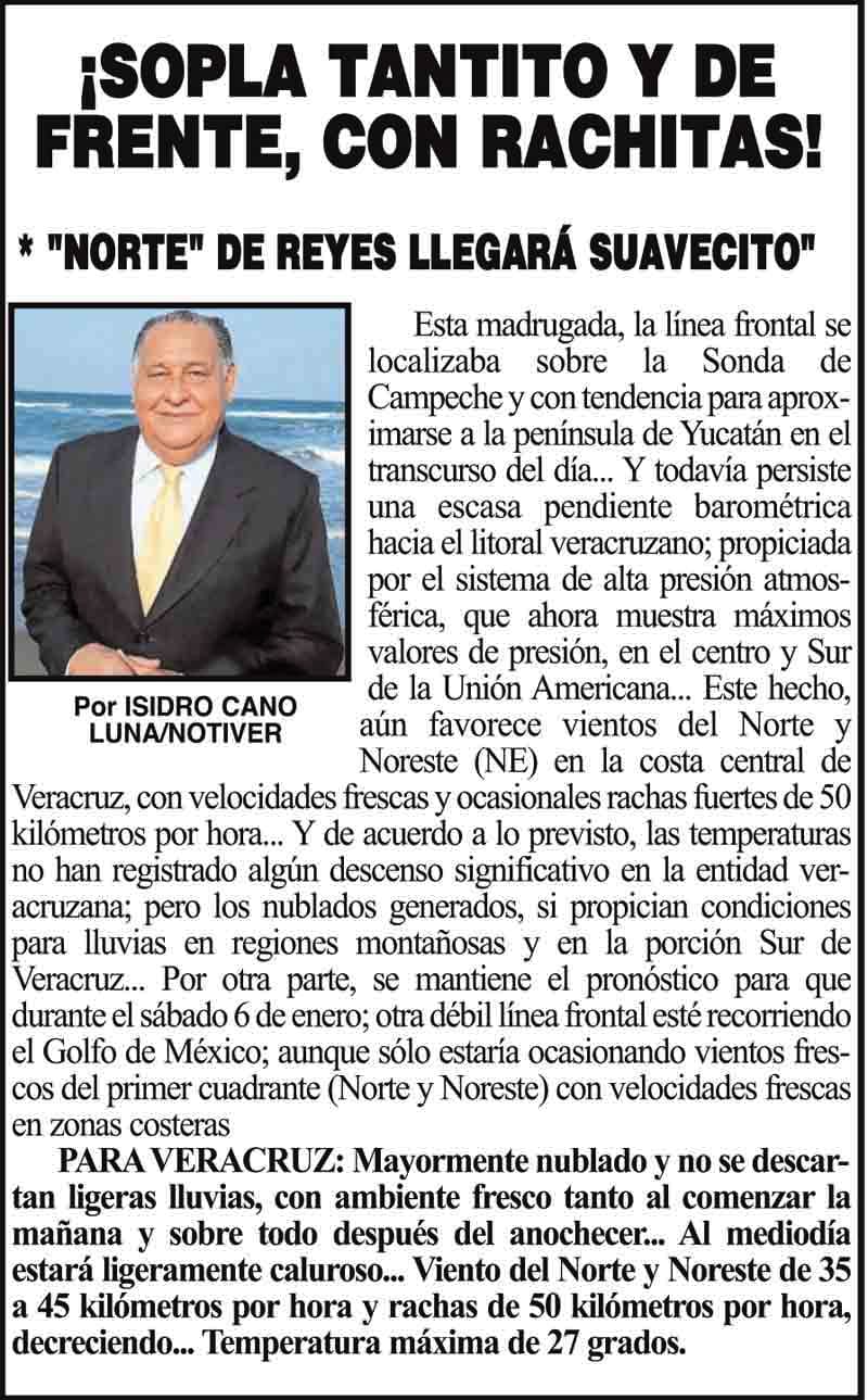PRIMERA ¡SOPLA TANTITO Y DE FRENTE, CON RACHITAS! * "NORTE" DE REYES LLEGARÁ SUAVECITO" 4 enero 2024 Más Noticias ¡BUSCAN SÚPER AGENTES! - EN BOCA ¡LE METEN LA DOLARIZA! - *A la modernización de Hutchinson LA ENCUESTA | - PONDRÁN LONAS DEL BIENESTAR! ¡AUMENTAN JAULAZOS EN GEO LOS PINOS! LOS CARTONES ¡MIL MILLONES DE DÓLARES! - PA’CONSTELLATION ¡MATAN A LAS ABEJAS! - CON FERTILIZANTES ¡LO RE-UTILIZARÁN! - EL CHAPOPOTE DE LAS PLAYAS ¡FUERON 9 AHOGADOS! - TRAS OPERATIVO SEMANA SANTA ESTATAL ¡EXIGEN QUE LE PAGUEN! - *Denuncia a aseguradora ya que solo quieren darle seis mil pesos