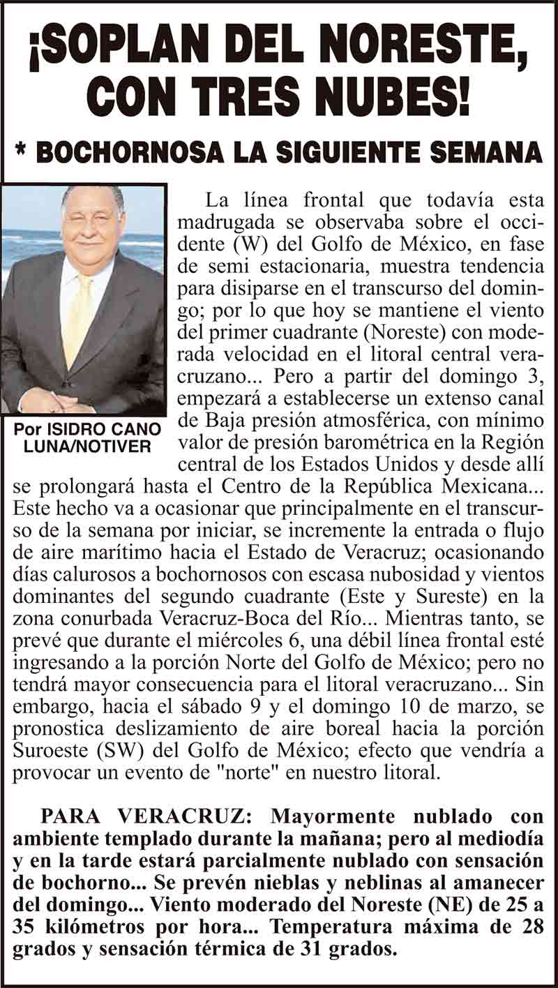 PRIMERA ¡SOPLAN DEL NORESTE, CON TRES NUBES! * BOCHORNOSA LA SIGUIENTE SEMANA 2 marzo 2024 Más Noticias ¡YA HAY TERNA! - RAÚL PEIMBERT EN LA LISTA ¡“CEMENTERIO”! - DE ULÚAS ¡INAUGURA PATY OTRA CALLE! ¡NO LE CREYERON! - Y LO BUSCAN NOTI-MEME | - ECOS DEL INFORME! ¡VERÓNICA VA CON NAHLE! - Y AL CONGRESO ¡“FAST TRACK”! - *Mientras el Mariner salía y entraba de Pajaritos en Coatzacoalcos ¡OPERATIVO LUPE-REYES! ¡MANDAN LA BILLETIZA! - *Corea manda 150 mil dólares ¡CRISTINA GANA LA ELECCIÓN!