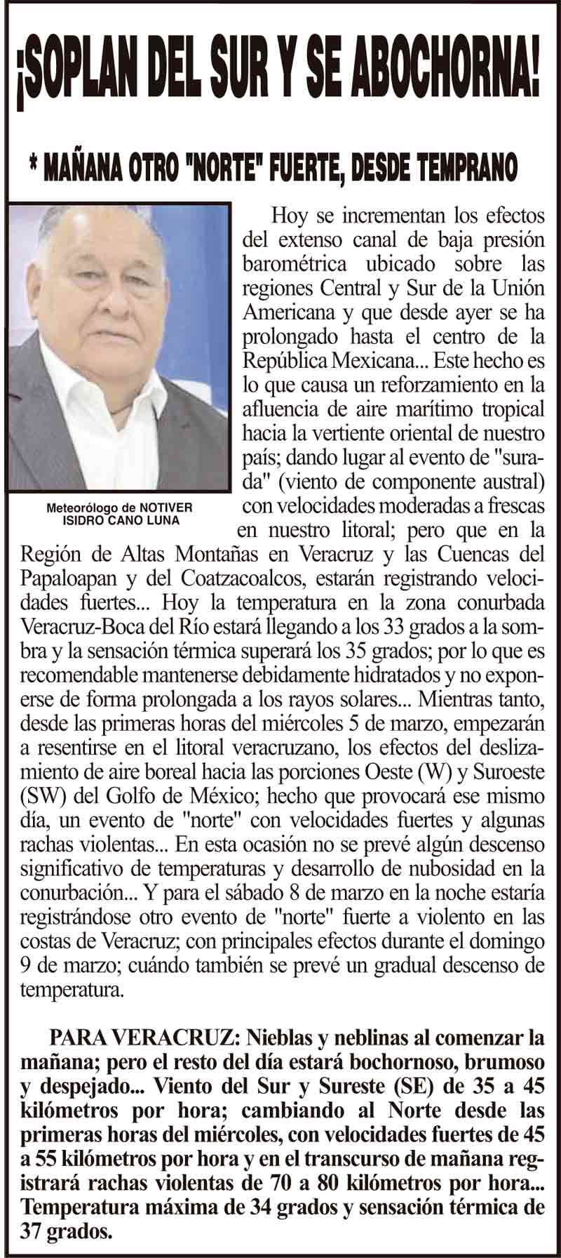 PRIMERA ¡SOPLAN DEL SUR Y SE ABOCHORNA! - *MAÑANA OTRO "NORTE" FUERTE, DESDE TEMPRANO 4 marzo 2025 Más Noticias ¡TRIPLE FEMINICIDIO! - TERROR EN TLAPACOYAN ¡A SACAR SUÉTERES! - *Alertan por el Frente Frío 18 ¡HABEMUS CORTE! - CARNAVAL 2026 ¡CLAUSURAN GRANJAS AVÍCOLAS! - *En Lerdo por falta de permisos 2025 ¡ATAQUE ARMADO A TRÁILER! - *No era de los Junior's Klan LOS CARTONES ¡CONMEMORARÁN EL ANIVERSARIO 112 DEL NATALICIO DEL “PIRATA” FUENTE! ¡PEGARÁ NORTAZO! - *Traerá rachas de 85 a 110 kph ¡SERÁ SALMA EMBAJADORA! - DEL MUNDIAL FIFA NOTI-MEME | - YA TIENES TU STARFUCKS?