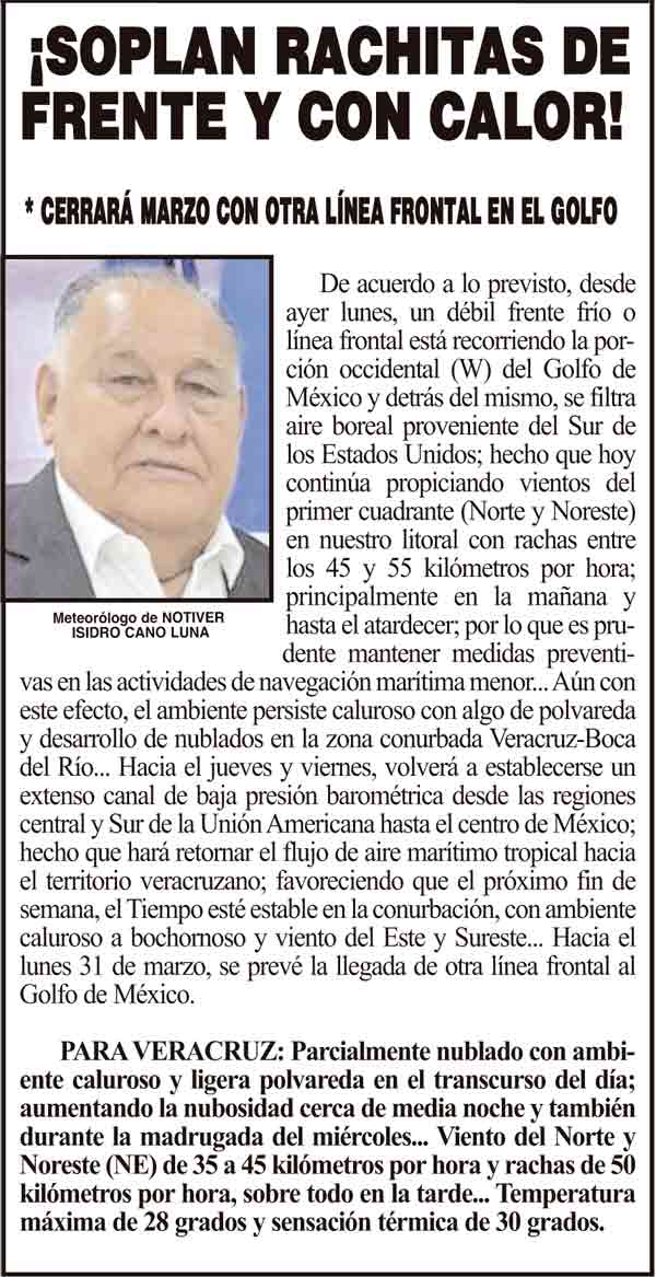 PRIMERA ¡SOPLAN RACHITAS DE FRENTE Y CON CALOR! - *CERRARÁ MARZO CON OTRA LÍNEA FRONTAL EN EL GOLFO 25 marzo 2025 Más Noticias ¡ATRAPADOS! - HAY VERACRUZANOS ¡MUERE FAMILIA EN INCENDIO! - TRAGEDIA EN RÍO BLANCO ¡CAMIONES CHINOS A XALAPA! ¡SE LES APARECE MARYJOSE! LOS CARTONES FUE LA PERCEPCIÓN TÉRMICA... ¡MEGA-OPERATIVO POR CABALGATA! - *Cierres viales y de limpieza por Cabalgata nacional en Veracruz puerto NOTI-MEME | - NO AGUANTAN EL CALOR!! ¡HASTA GRANIZÓ! - PURAS BOLAS ¡CAYÓ EN XALAPA! - *Se repartirán ocho millones y medio