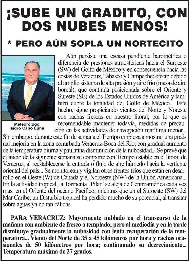 PRIMERA ¡SUBE UN GRADITO, CON DOS NUBES MENOS! * PERO AÚN SOPLA UN NORTECITO 4 noviembre 2023 Más Noticias ¡ASESINAN A EX CANDIDATO A LA ALCALDÍA DE MISANTLA! - *Era del Movimiento Ciudadano ¡HOMENAJE PÓSTUMO AL “PAPO”! ¡SE VA EL FOFO! - DEL PRI LA ENCUESTA | - FELICIDADES! ¡SE DESCARRILA EL TREN! - PA’SUSTO ¡YA NO COBRARÁN PARQUÍMETROS! ¡SE VAN POR LAS NUBES LOS PAVOS! ¡DETECTAR DISFAGIA A TIEMPO PREVIENE LAS COMPLICACIONES DE SALUD: IMSS VERACRUZ NORTE! ¡CUATRO MUNICIPIOS SUBIRÁN EL PREDIAL! - YA SE SUPO ¡CUMBRE DE TRANSPORTE MULTIMODAL!
