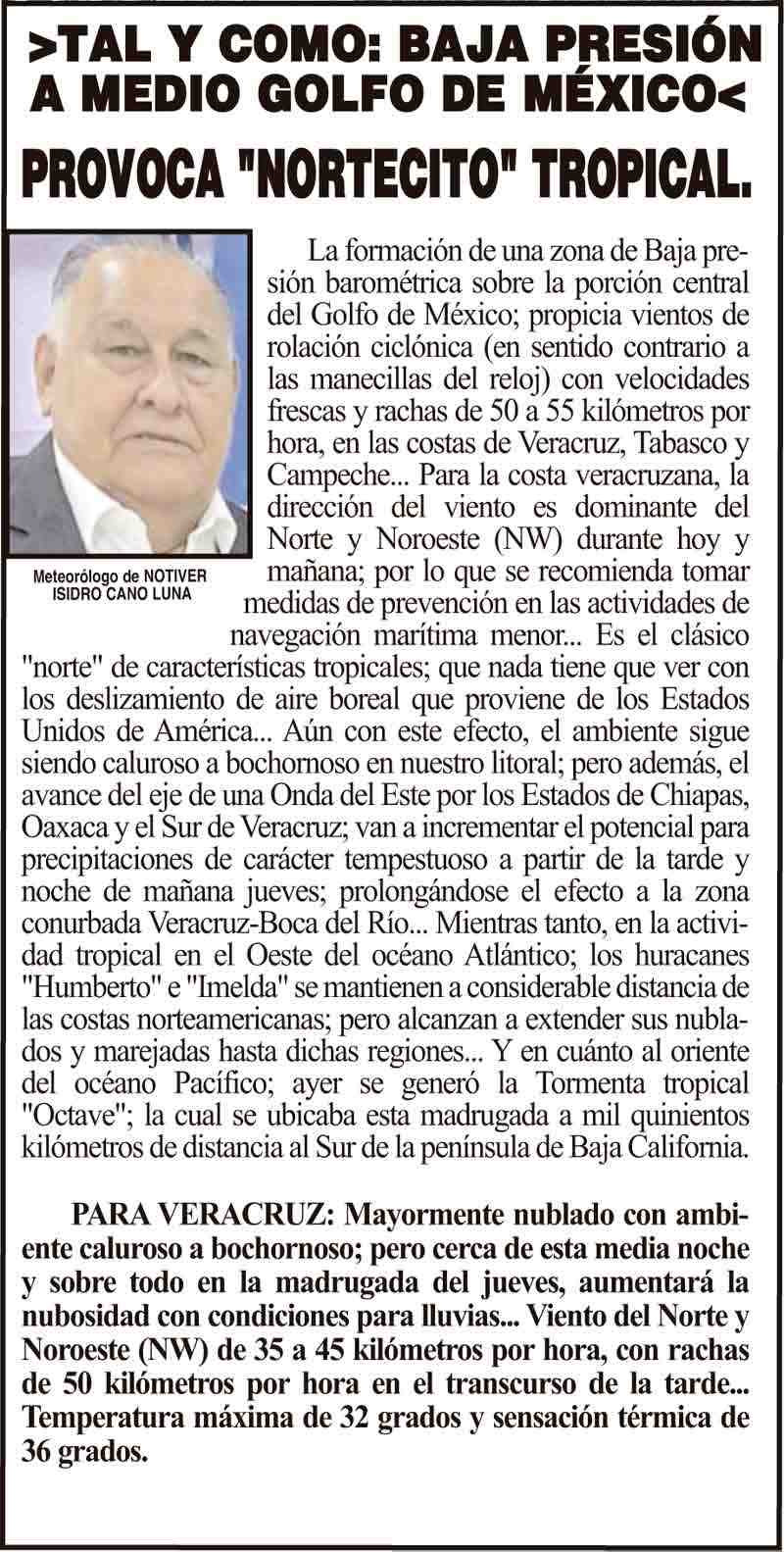 PRIMERA >TAL Y COMO: BAJA PRESIÓN A MEDIO GOLFO DE MÉXICO< - *PROVOCA "NORTECITO" TROPICAL... 1 octubre 2025 Más Noticias LA ENCUESTA | - ME ESTÁS OYENDO INÚTIL?... ¡CON BAILONGOS QUIEREN AYUDAR A LOS DAMNIFICADOS DEL NORTE! - *El mismo Alor, toca los timbales ¡YA SE LA APROBARON! - REFORMA PARA LA FISCALÍA ESTATAL NOTI-MEME | - ASÍ ESTUVO EL INFORME... ¡MÁS DE 9 MIL MILLONES! - *Eso costaría cancelar en Veracruz al Grupo MAS ¡LE DAN LUZ VERDE! - DESDE GUATEMALA ¡EL CUARTO! ¡Y COM-PA-RE-CIÓ! - ÁNDALE... ¡NO SE VA LISBETH AURELIA! - *Descarta ir a la Fiscalía y que seguirá como magistrada ¡CREAN EL SÚPER MAÍZ!