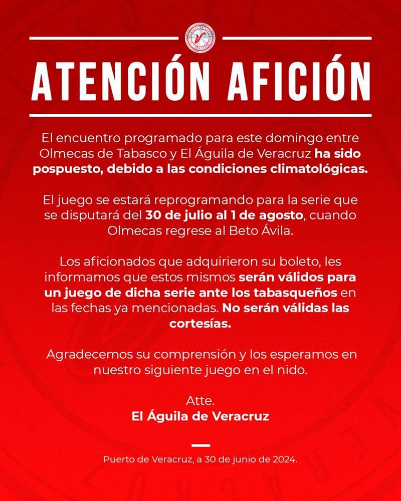 Debido a los pronósticos del tiempo la directiva del equipo con documento fechado a 30 de junio de 2024, hicieron un llamado a la afición veracruzana para advertir que el encuentro programado para este domingo entre Olmecas de Tabasco y el Águila de Veracruz, sería pospuesto debido a las condiciones climatológicas.