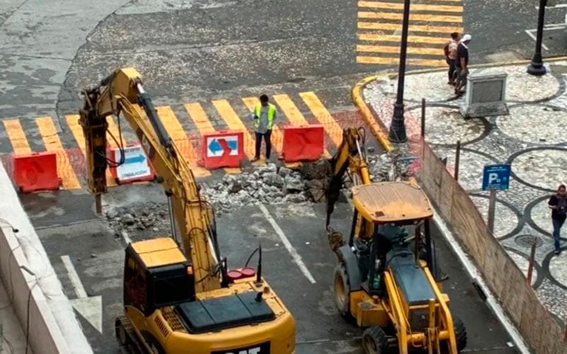 Maquinaria pesada se mantiene en el lugar para retirar el asfalto existente, como parte del proyecto que contempla la pavimentación con concreto estampado.