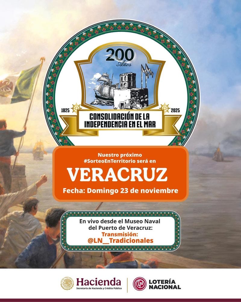Este domingo 23 de noviembre, la Lotería Nacional anunció que su sorteo se llevará a cabo desde el Museo Naval de este Puerto de Veracruz, lo anterior dentro del marco del 200 Aniversario de la consolidación de la Independencia en el mar.