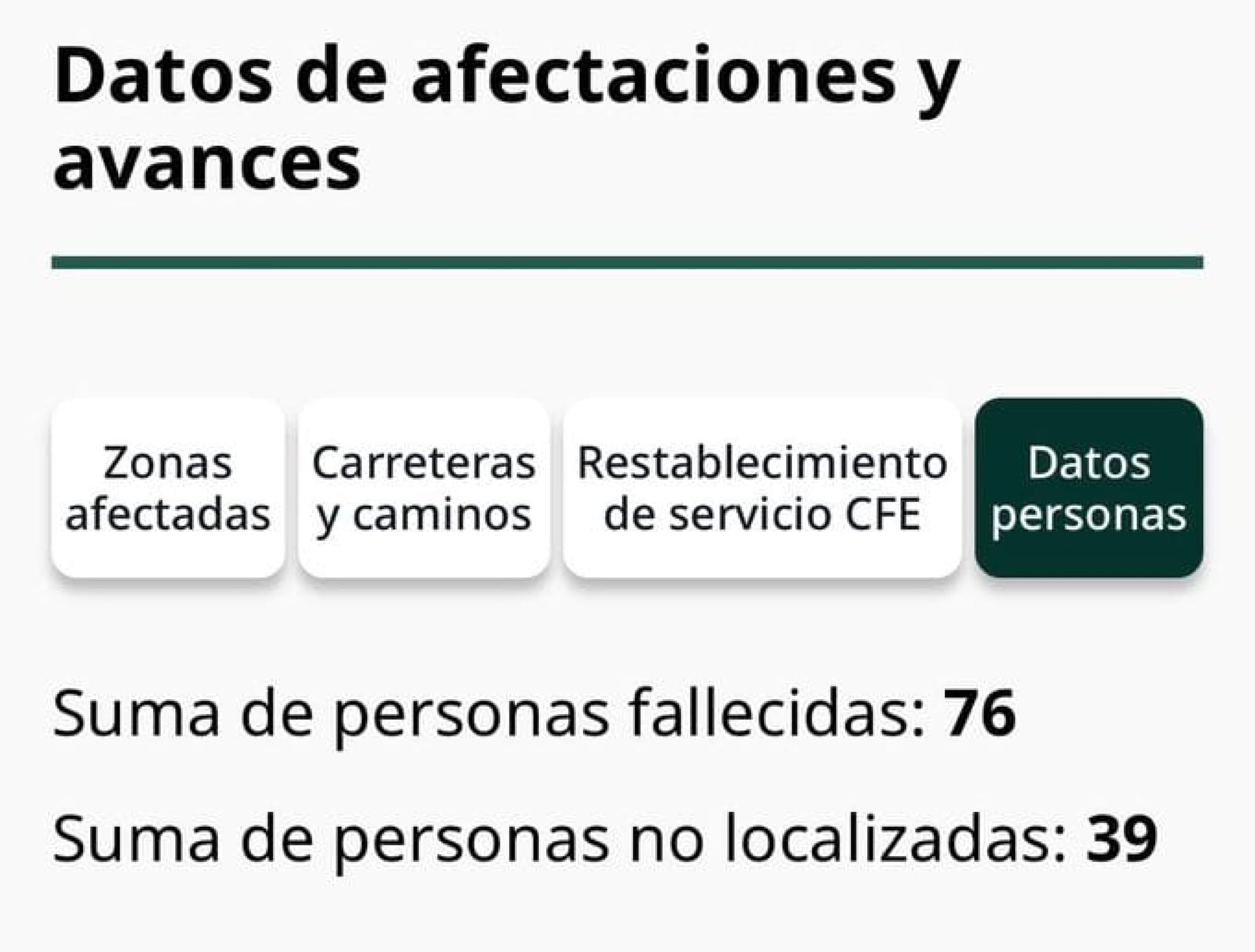 Hasta este viernes, en el micrositio oficial del Gobierno de México se reportó que la cifra de fallecidos por las lluvias e inundaciones que afectaron principalmente a 5 estados aumentó a 72 y las personas aún desaparecidas es de 48.