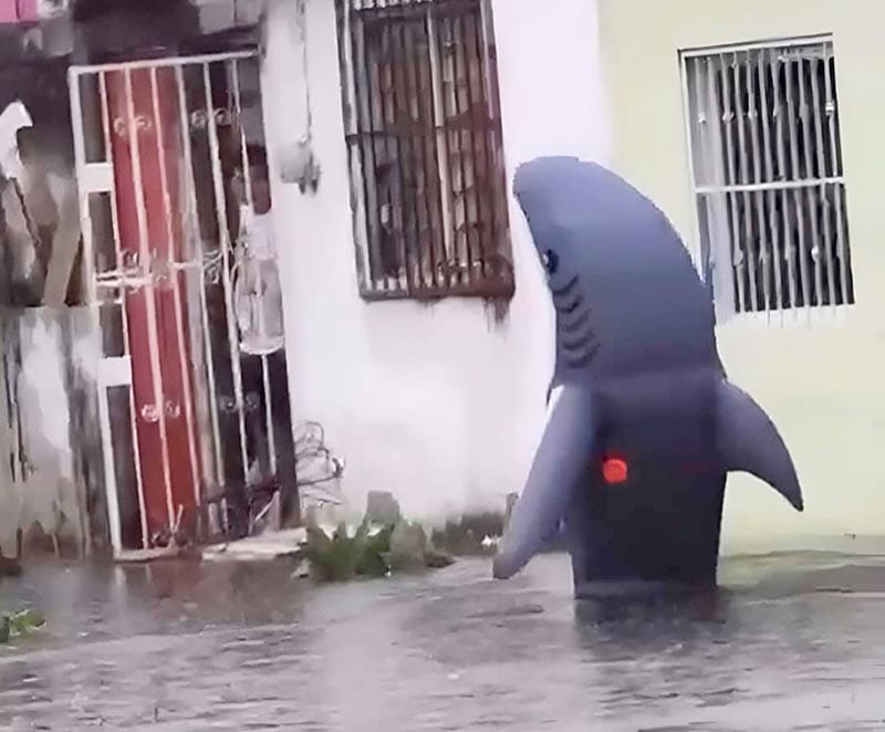Para rematar, los jarochos cerraron con un video de la botarga de un tiburoncito, caminando y saludando bajo una calle inundada al parecer de la avenida Yañez de la ciudad de Veracruz.