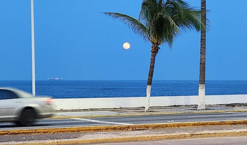 Como a las 19:00 horas, se asomó la Luna llena color rojo, luego naranja, y cada que oscurecía se mostraba más imponente sobre el Golfo de México.