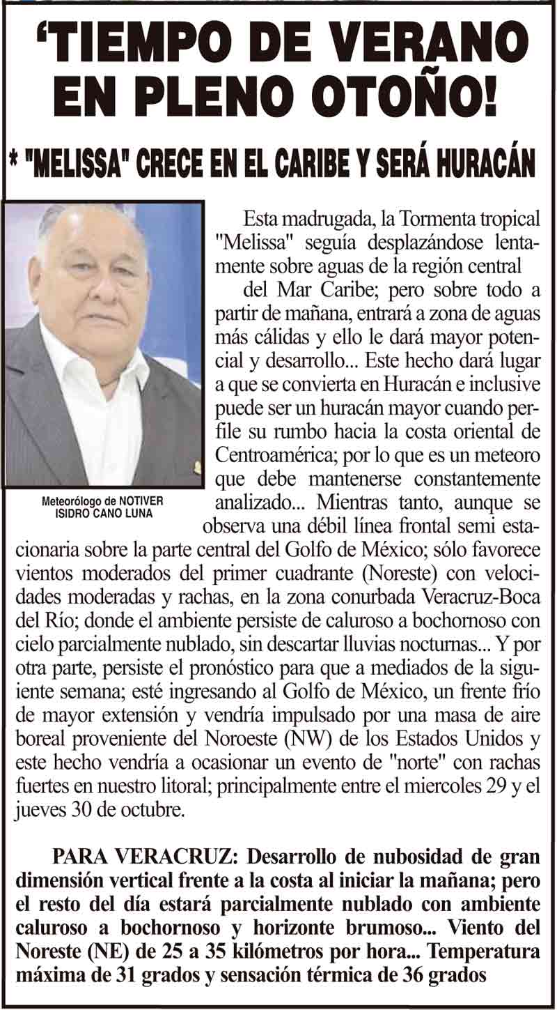 PRIMERA ‘TIEMPO DE VERANO EN PLENO OTOÑO! - *"MELISSA" CRECE EN EL CARIBE Y SERÁ HURACÁN 23 octubre 2025 Más Noticias LA ENCUESTA | - ME ESTÁS OYENDO INÚTIL?... ¡CON BAILONGOS QUIEREN AYUDAR A LOS DAMNIFICADOS DEL NORTE! - *El mismo Alor, toca los timbales ¡YA SE LA APROBARON! - REFORMA PARA LA FISCALÍA ESTATAL NOTI-MEME | - ASÍ ESTUVO EL INFORME... ¡MÁS DE 9 MIL MILLONES! - *Eso costaría cancelar en Veracruz al Grupo MAS ¡LE DAN LUZ VERDE! - DESDE GUATEMALA ¡EL CUARTO! ¡Y COM-PA-RE-CIÓ! - ÁNDALE... ¡NO SE VA LISBETH AURELIA! - *Descarta ir a la Fiscalía y que seguirá como magistrada ¡CREAN EL SÚPER MAÍZ!