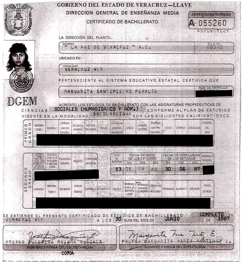 Margarita Santopietro Peralta, próxima titular de la Secretaría de Desarrollo Social (SEDESOL), del estado de Veracruz, cuenta con un nivel máximo de estudios de bachillerato cursados en una escuela del Puerto Jarocho.