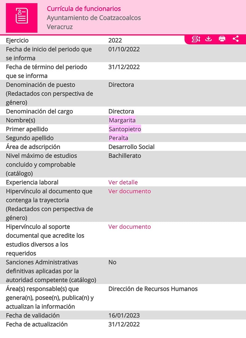Los datos públicos proporcionados por el ayuntamiento de Coatzacoalcos confirman que, a mediados del 2022, el último nivel de estudios de la empresaria constructora es el bachillerato.