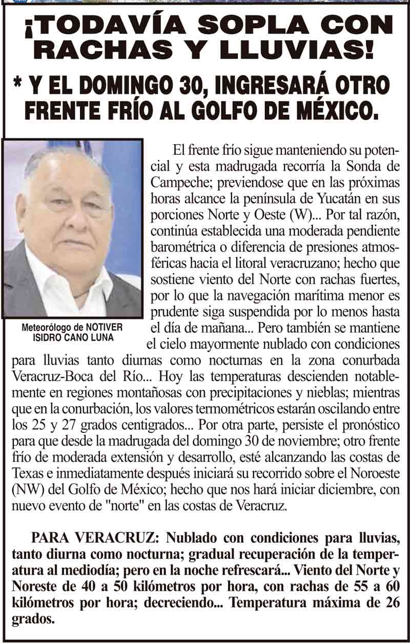 PRIMERA ¡TODAVÍA SOPLA CON RACHAS Y LLUVIAS! - *Y EL DOMINGO 30, INGRESARÁ OTRO FRENTE FRÍO AL GOLFO DE MÉXICO. 28 noviembre 2025 Más Noticias ¡HOY SOPLA FRESCO Y DE FRENTE! - *PERO EL LUNES 8, ESTARÁ FUERTE Y CON LLUVIAS. LA ENCUESTA | - ME ESTÁS OYENDO INÚTIL?... ¡CON BAILONGOS QUIEREN AYUDAR A LOS DAMNIFICADOS DEL NORTE! - *El mismo Alor, toca los timbales ¡YA SE LA APROBARON! - REFORMA PARA LA FISCALÍA ESTATAL NOTI-MEME | - ASÍ ESTUVO EL INFORME... ¡MÁS DE 9 MIL MILLONES! - *Eso costaría cancelar en Veracruz al Grupo MAS ¡LE DAN LUZ VERDE! - DESDE GUATEMALA ¡EL CUARTO! ¡Y COM-PA-RE-CIÓ! - ÁNDALE... ¡NO SE VA LISBETH AURELIA! - *Descarta ir a la Fiscalía y que seguirá como magistrada